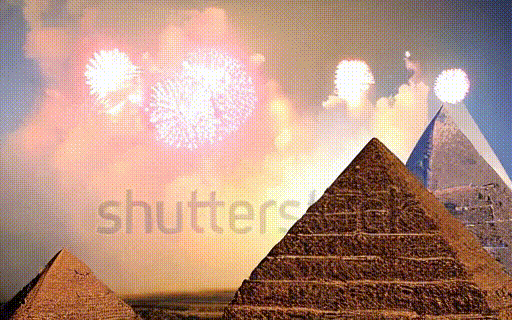 Fireworks explode over the pyramids. |