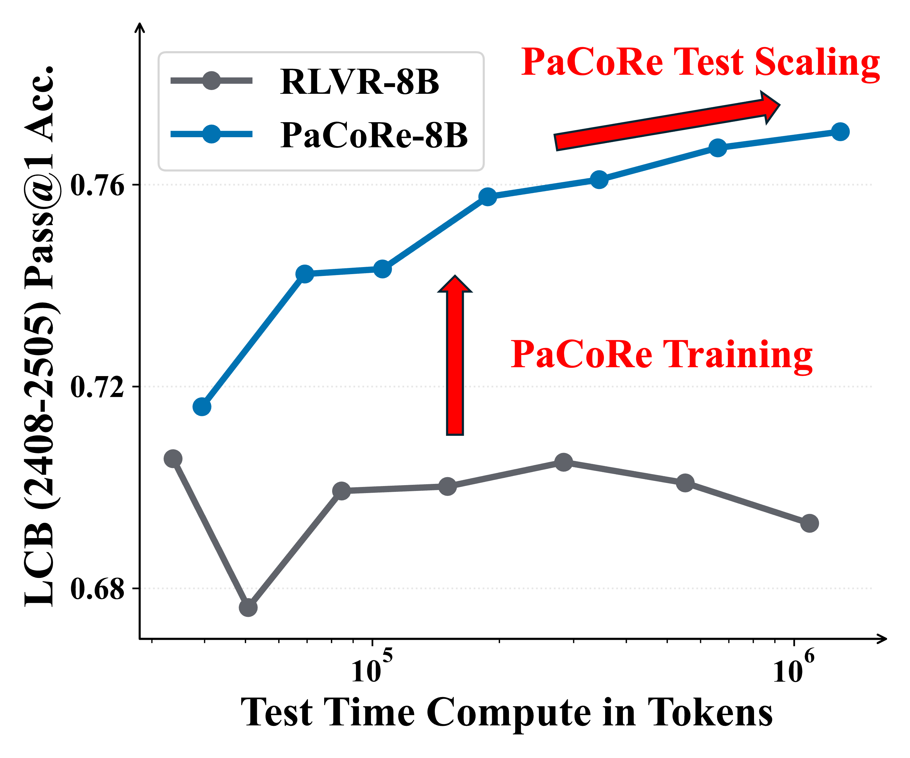 Figure 1 | Parallel Coordinated Reasoning (PaCoRe) performance. Left: On HMMT 2025, PaCoRe-8B demonstrates remarkable test-time scaling, yielding steady gains and ultimately surpassing GPT-5. Right: On LiveCodeBench, the RLVR-8B model fails to leverage increased test-time compute, while PaCoRe-8B model effectively unlocks substantial gains as the test-time compute increases.
