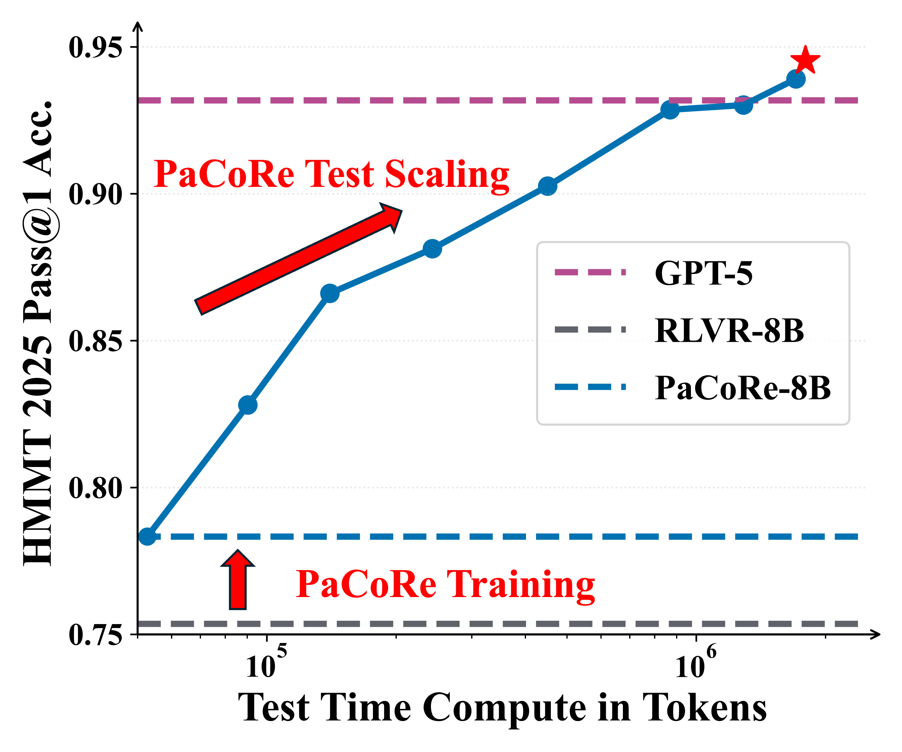The approach yields strong improvements across diverse domains, and notably pushes reasoning beyond frontier systems in mathematics: an 8B model reaches 94.5% on HMMT 2025, surpassing GPT-5โs 93.2% by scaling effective TTC to roughly two million tokens.
